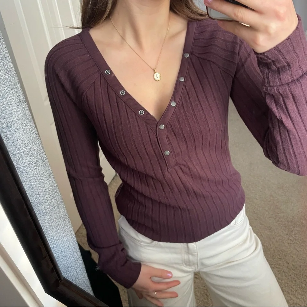 Burgundy Ribbed V-Neck Snap Button Top