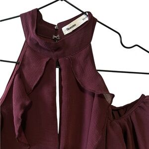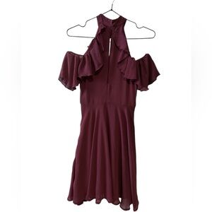 Beautiful burgundy dress. Features cold shoulders and ruffles. Keyhole neckline. A-line silhouette. Lightweight fabric.