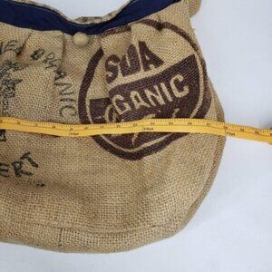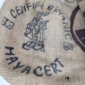 Hippie Boho burlap sack shoulder bag. Graphics include organic, maya cert, numbers etc
