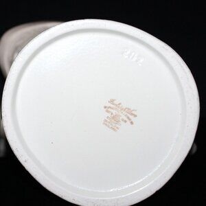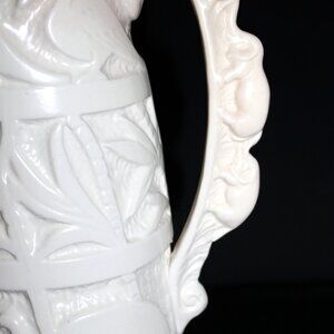 This lovely creamy white jug has flora and fauna molded into the design, and an elephant shaped handle. Made by Burleigh Ware in Burslem, England, they are renowned for their ornate handles. Maker's mark dates this piece to the 1940's. It's in very good vintage condition without any chips, cracks, or crazing. There is some light discoloration on the handle and top of the rim, as well as inside the jug. It is 9" tall and a width of 7" from spout to handle.