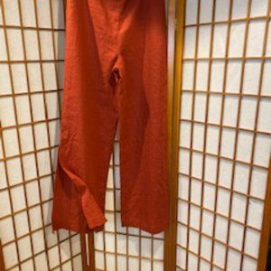 Dark amber color pants in linen and viscose fabric blend. High waisted pants have side zipper, slit up the outside of legs. Size large, waist is 32 inches with elastic in back expands to 40 inches, inseam 31 inches, hip 38 inches, rise 13 inches.