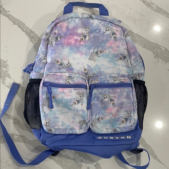 Vibrant Burton backpack with character design. Features multiple compartments and side mesh pockets.