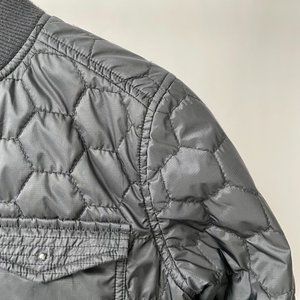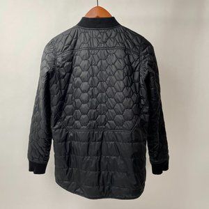 Love this lightweight puffer in a contrasting honeycomb quilted pattern and horizontal baffles. Two fleece lined slash pockets and a single flap pocket at the left chest. Ribbed knit crew neck and cuffs. Shell is water resistant. Fully lined.