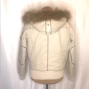 Heavy weight cotton snowboarding jacket with soft cotton flannel quilted plaid lining. Numerous pockets (fashionable distressing accents). Ribbed knit cuff and hem. Removable faux fur on hood. Machine washable. Laying flat underarm to underarm measures 21’.