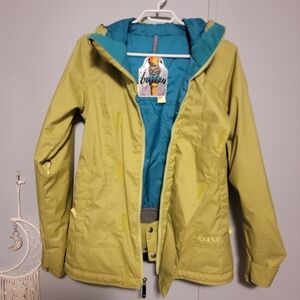 Unique muted lime green Burton ski jacket with turquoise blue lining in excellent condition. This jacket has a powder skirt with 2 snaps and a super cute asymmetric velcro zipper cover which adds a little visual appeal to the style. Hood is NOT removable.