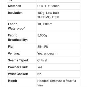 DRYRIDE fabric [10,000mm/5,000g] is highly breathable, waterproof, and quick drying; Critically-taped seams lock out the elements