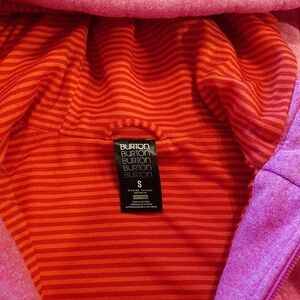Burton women's size Small purple shade, lined, hood attached vest, can be worn snapped down or zipped up, lots of possibilities to style, chest pocket snaps shut, the inside lining is jersey striped red shades, minimal wear, very minor rub wear, nice spring/fall weight