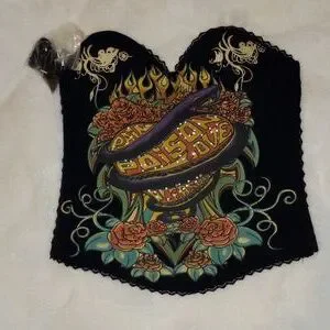 Cool Printed Rhinestone Corset with Devil Snake and Fire Rose. Three lines hook eye at back make size adjustable.