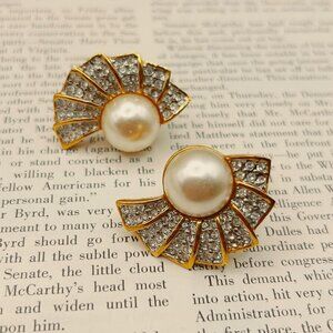 Vintage Butler clip-on earrings with a large faux pearl center and clear rhinestones. Gold-tone metal, weighty and well-made. Comfortable Butler clip design.