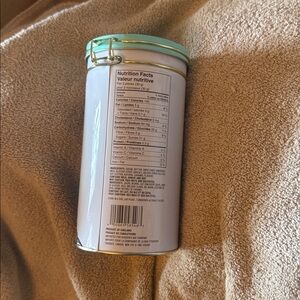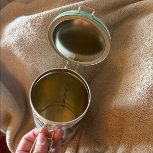 Elegant butter fudge tin featuring a classic portrait design. Accented with a light blue lid and gold clasp.