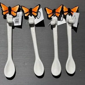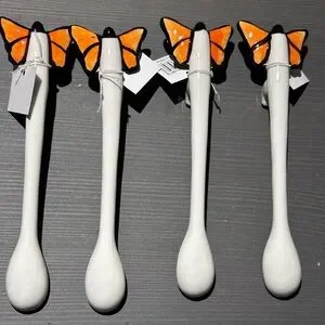 Set of ceramic spoons with butterfly design. Features vibrant orange and black butterflies on white handles.