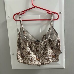 Embrace a playful style with this butterfly print camisole top. Featuring a charming cream and brown leopard pattern, this piece is perfect for adding a touch of whimsy to your wardrobe.