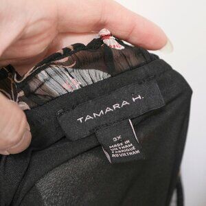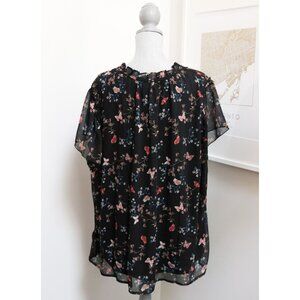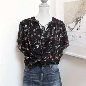 Flowy tie neck short sleeve top with a dark red and blue floral pattern on black. Sheer faux silk with a black lining and romantic fluttery sleeves.