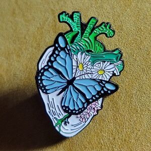 Butterfly flower garden anatomical eco heart enamel lapel pin with soft rubber pinback. NWT.