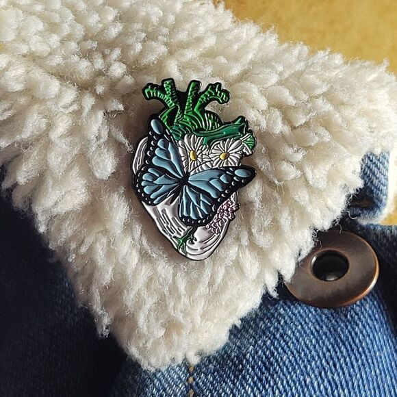Butterfly flower garden anatomical eco heart enamel lapel pin with soft rubber pinback. NWT.