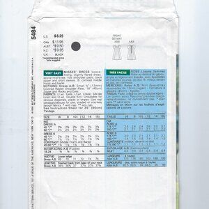 This is vintage Butterick Ronnie Heller Fast & Easy Pattern #5484 from 1991 is "Very Easy". It contains sizes 6-8-10 for Misses' dress: loose-fitting, slightly flared dress, above mid-knee, has shoulder pads, back zipper and short sleeves. The pattern pieces have not been cut and are still factory folded.