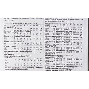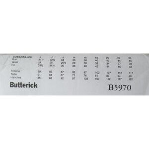 This pattern will accommodate Misses' sizes 8, 10, 12, 14, and 16; bust sizes 31.5" - 38", waist sizes 24" - 30", and hip sizes 33.5" - 40".