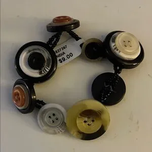 Unique bracelet featuring a variety of button designs in black, brown, cream, and gold.