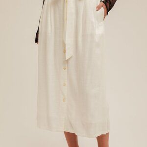 Breezy, effortless, and timeless. This lightweight linen-blend midi skirt features a flattering high waist with an adjustable self-tie belt, full button down front, and convenient side pockets. The relaxed silhouette makes it perfect for casual outing, vacations, or warm-weather layering.