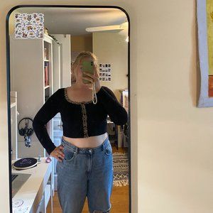button up cropped fitted cardigan with leopard print trim