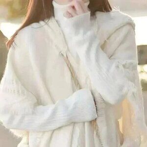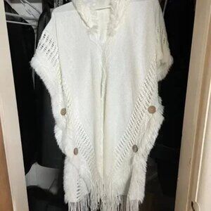 Button Side Hooded Cape Tassel Trim Angel Poncho Sweater White
