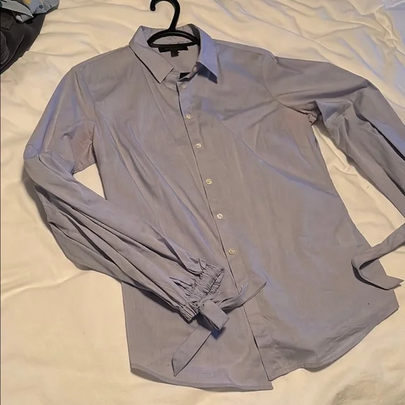 Light blue. Really nice blouse because the body is fitted and the sleeves are statement, with a slight puff