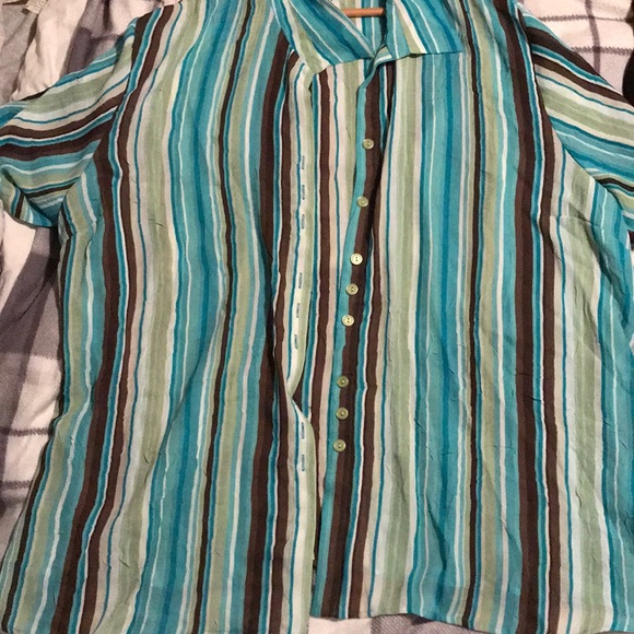 This is a brand new colourful button down shirt. It has light and dark blue some green brown and white in it.