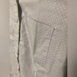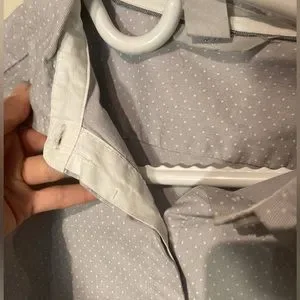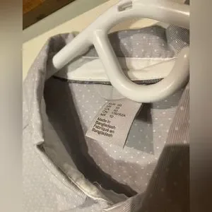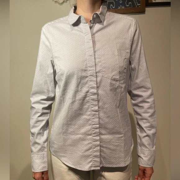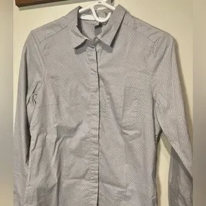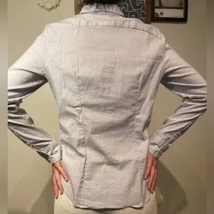 Long sleeve button down shirt. Colour is a blue/grey with really small white polka dots. Detailing in white. From H&M. Size 10, fits a small/medium. Stretchy, well structured fabric, fits well.