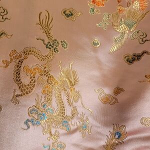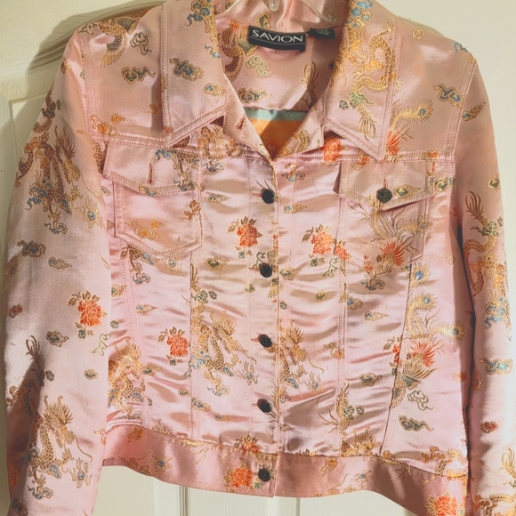 Pink polyester and nylon button up jacket. Asian design with dragon stitching.