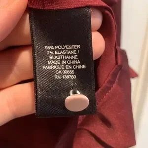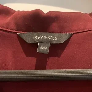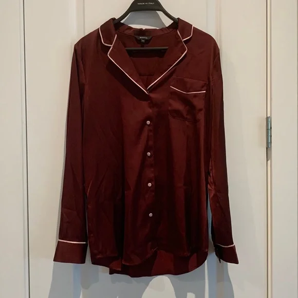 Maroon / wine colour button up blouse with pink trim and buttons.