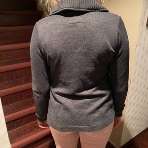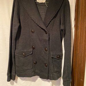 Ladies Fall Jacket button up grey gently used measurements are from armpit to armpit, length of arm and length of back. From pet friendly home clean but might have stray hair.