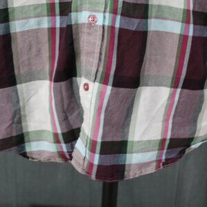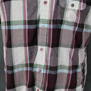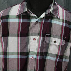 Up for sale is a button-down shirt by Matix. It has a white base colour with a maroon and blue plaid pattern over top. What a great shirt do not miss out on it.