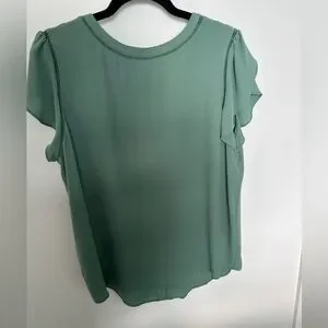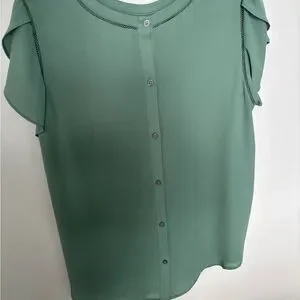Pretty button-down back blouse with flutter sleeve. Chiffon like material. There is some very minor damage to the bottom front where there blouse was tucked in. Priced to reflect.
