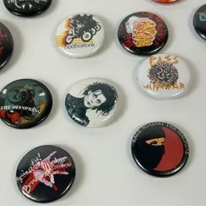 Diverse set of buttons with vibrant graphics. Ideal for personalizing bags or jackets. Small ones size of dimes. Medium the size of toonies.