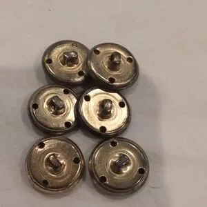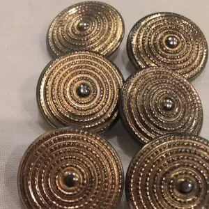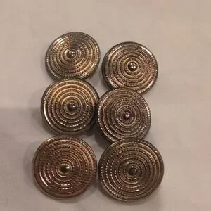 Set of six gold buttons. Intricate circular pattern. Perfect for crafts and sewing projects.