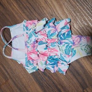 Adorable floral ruffle swimsuit with vibrant colors. Perfect for a fun day at the beach.