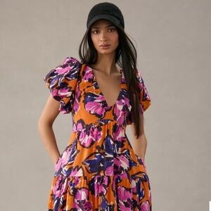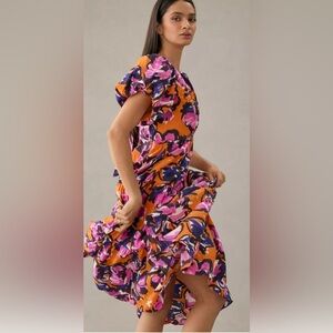 By Anthropologie Puff Sleeve Midi Floral Orange and Purple Dress size S