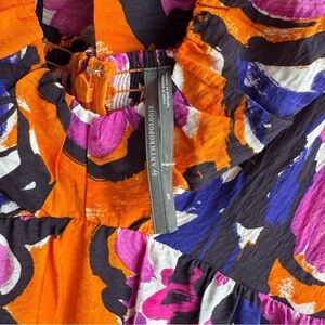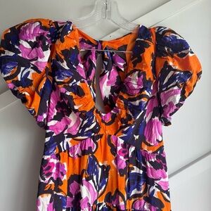 By Anthropologie Puff Sleeve Midi Floral Orange and Purple Dress size S