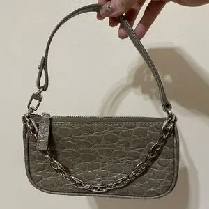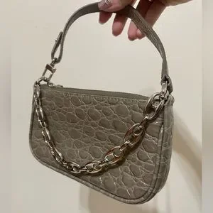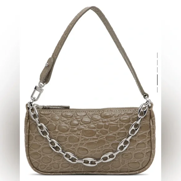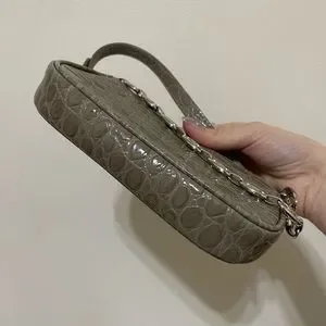 Croc-embossed leather shoulder bag in taupe. Chain link carry handle at top. Partially detachable shoulder strap with post-stud and lanyard clasp fastening. Zip closure. Leather logo patch at interior. Twill lining in beige. Silver-tone hardware.