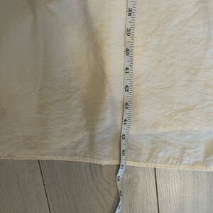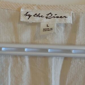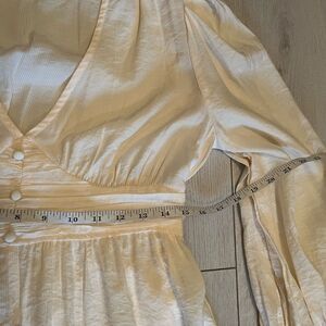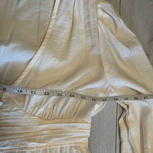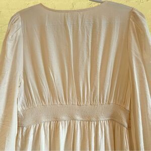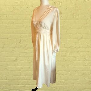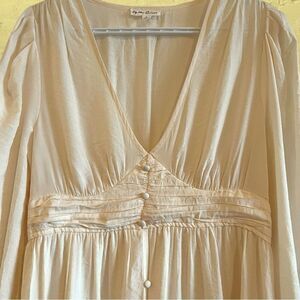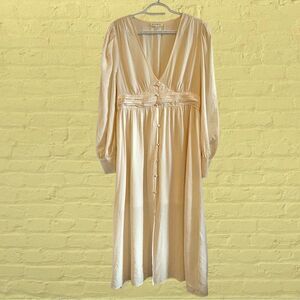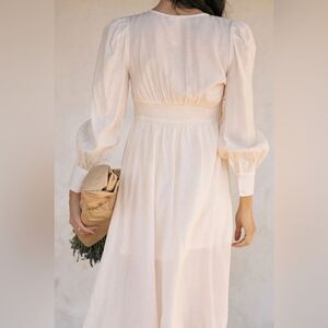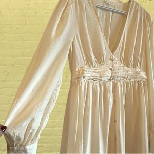Beautiful romantic cottage dress from By the River. This is the Gabriella dress. Deep v neck with long billowy sleeves, midi length, slip underneath, decorative buttons. Smocked back waist. Colour is veryyyyy pale yellow/white tiny stripes that you can only notice from very close.z Size large, fits a little small. Would fit a medium/small large best. Excellent condition.