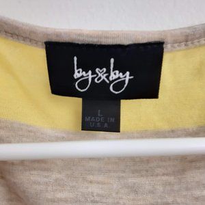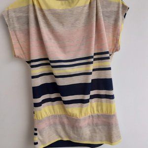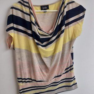 Description: tshirt with hanging neck-line, navy blue, yellow, and pink stripes on tan