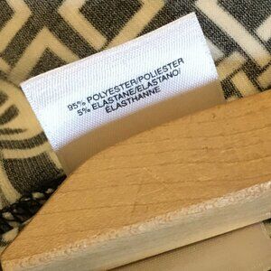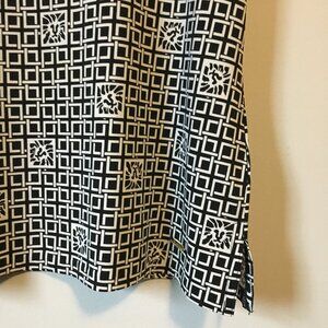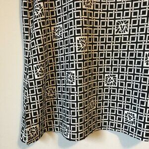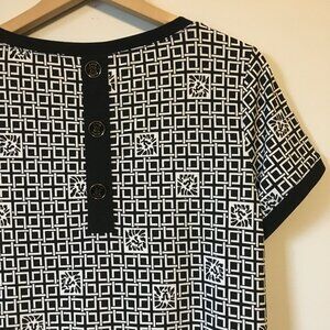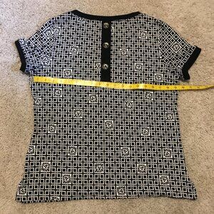 Good preowned condition, stretchy, white short sleeve top with thick black cuffs, collar and faux buttons on the back. A lion head tile and square weave pattern tie it seamlessly together. Super duper cute. Love it.