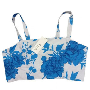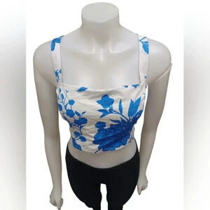 Adjustable straps, this blue and white floral patterned crop, features a smocked back with a lined bodice. 100% cotton. Stretch available.