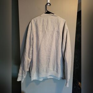 Stylish light gray bomber jacket with zip pockets. Perfect for casual wear.