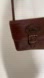 Il Mondo brown faux leather cross body bag by Cabrelli. Made in Canada. Mini size. Foldover top with magnetic snap closure. Brass buckle accent on flap. Classic pattern fabric interior.