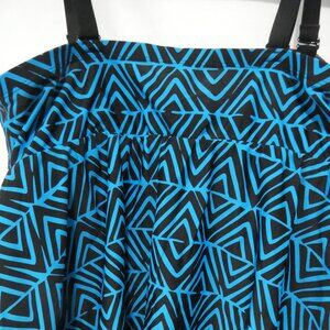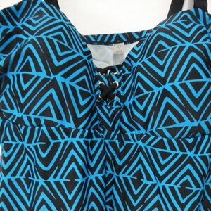 Add a splash of geometric flair to your summer wardrobe with this eye-catching blue and black tankini top