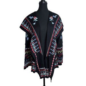 CAITE Embroidered Black Open Front Cardigan with Hood Boho Festival Style, Small