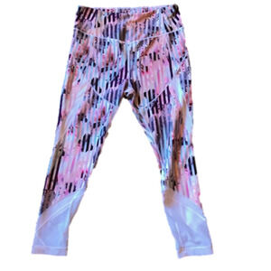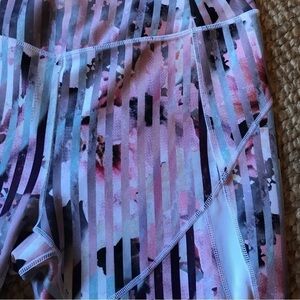 Beautifully coloured leggings with mesh panel at the bottom. Great fit! Zip pocket at waistband. Gorgeous and flattering vertical stripes! Excellent condition.