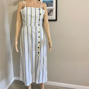 Great preowned. No flaws. Zipper at the right side so it can be adjusted when fitting. Slit at the back of the dress. Button is just a style at the front.