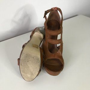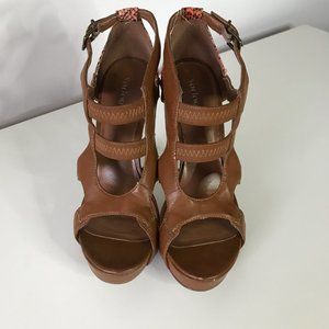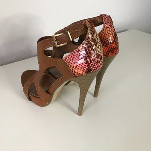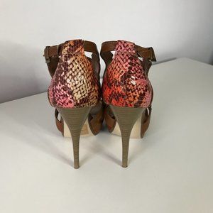 High heel sandals with platform. Heel height 5". Cognac Brown with pinkish snake skin print on heel. General wear with some scuffs but overall in good condition, no defects. Size 38 which is 7.5.